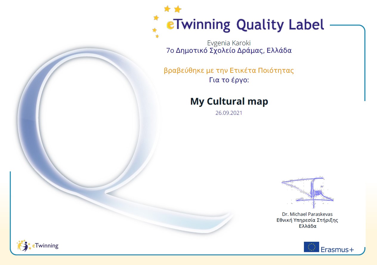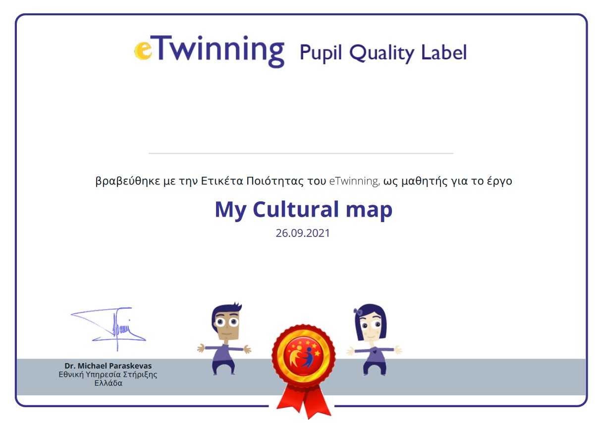 Εθνική ετικέτα ποιότητας eTwinning για το έργο "Μy Cultural Map"Δημοσιεύθηκε : Τρίτη, 28 Σεπτεμβρίου 2021 08:41 | Γράφτηκε από τον/την Καρόκη Ευγενία ΠΕ86