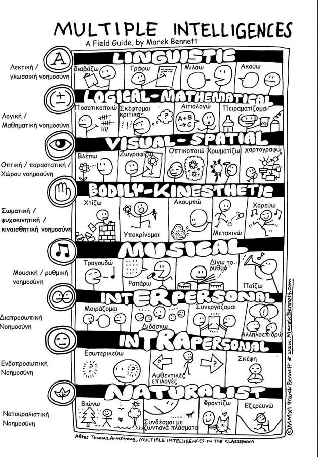 Πιο επιστημονικά, η διαφορετικότητα στη μάθηση εξηγείται με τις πολλαπλές νοημοσύνες (Gardner H.) οι οποίες παραθέτονται έξυπνα, απλά και κατανοητά στην παρακάτω εικόνα (κάντε κλικ για να μεγαλώσει). Αυτές οι πολλαπλές νοημοσύνες κάνουν τα συνήθη IQ τεστ να φαίνονται αστεία και ανακριβή και διαφοροποιούν τις δεξιότητες, επομένως τη μαθησιακή και αργότερα επαγγελματική πορεία του καθενός από εμάς.